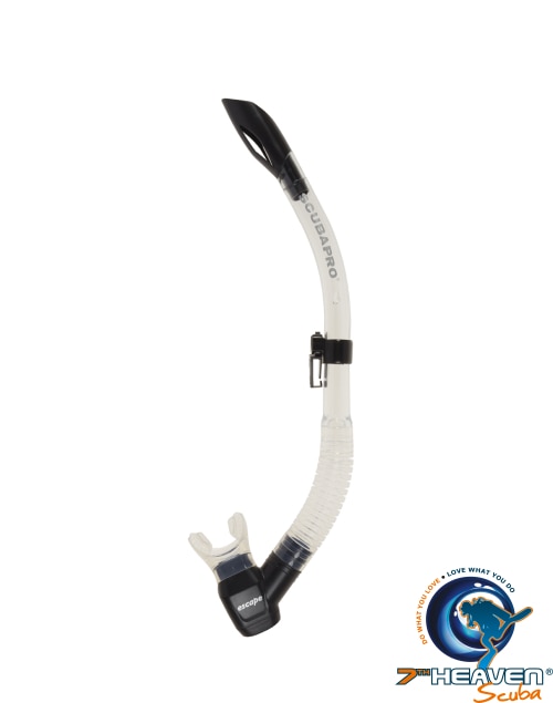 Semi-dry top design prevents water entry into tube. Large bore tube for easy breathing. Flexible, corrugated section drops snorkel from face when not in use. Ergonomic mouthpiece for added comfort. Purge valve at lowest point for effortless clearing. Cellphone-style removable clip.